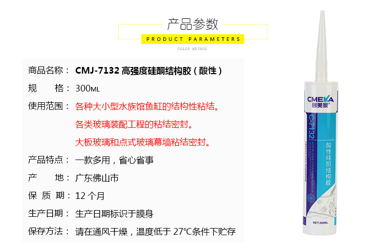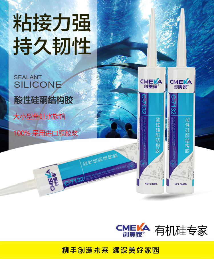 1、創(chuàng)美家C-7132系單組份、醋酸型、高模量、室溫固化結(jié)構(gòu)膠。